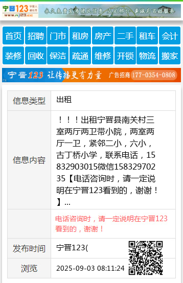 !!!出租宁晋县南关村三室两厅两卫带小院,两室两厅一卫,紧邻二小,六小,古丁桥小学,联系电话,15832903015微信15832970235 【电话咨询时,请一定说明在宁晋123看到的,谢谢!】 |