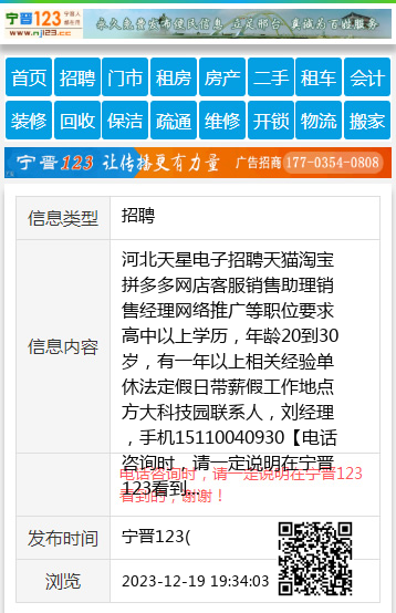河北天星电子招聘天猫淘宝拼多多网店客服销售助理销售经理网络推广等职位要求高中以上学历,年龄20到30岁,有一年以上相关经验单休法定假日带薪假工作地点方大科技园联系人,刘经理,手机15110040930 【电话咨询时,请一定说明在宁晋123看到的,谢谢!】 |