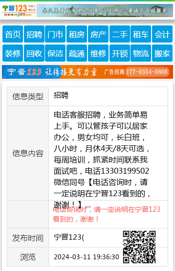 电话客服招聘,业务简单易上手。可以管孩子可以居家办公,男女均可,长白班,八小时,月休4天/8天可选,每周培训,抓紧时间联系我面试吧,电话13303199502微信同号 【电话咨询时,请一定说明在宁晋123看到的,谢谢!】 |