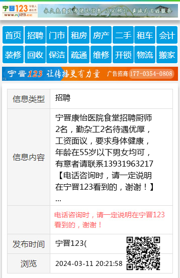 宁晋康怡医院食堂招聘厨师2名,勤杂工2名待遇优厚,工资面议,要求身体健康,年龄在55岁以下男女均可,有意者请联系13931963217 【电话咨询时,请一定说明在宁晋123看到的,谢谢!】 |