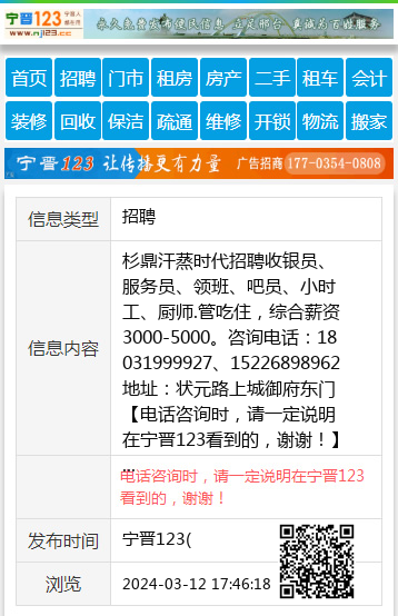 杉鼎汗蒸时代招聘收银员、服务员、领班、吧员、小时工、厨师.管吃住,综合薪资3000-5000。咨询电话:18031999927、15226898962地址:状元路上城御府东门 【电话咨询时,请一定说明在宁晋123看到的,谢谢!】 |