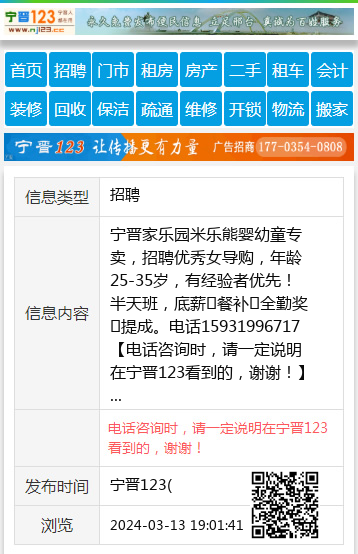 宁晋家乐园米乐熊婴幼童专卖,招聘优秀女导购,年龄25-35岁,有经验者优先!半天班,底薪➕餐补➕全勤奖➕提成。电话15931996717 【电话咨询时,请一定说明在宁晋123看到的,谢谢!】 |