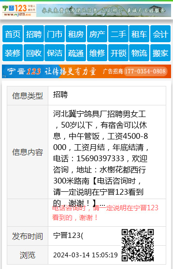 | 防骗提醒: | 宁晋123(www.nj123.cc)提醒您:手工活、网络兼职、刷单,都是骗子!凡以各种名义收取费用的都是骗子!找工作是往兜里挣钱,让你往外掏钱的都是骗子!异地招聘请提高警惕,谨防诈骗! |