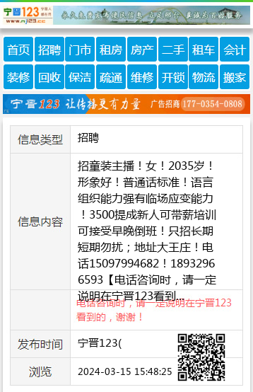 招童装主播!女!2035岁!形象好!普通话标准!语言组织能力强有临场应变能力!3500提成新人可带薪培训可接受早晚倒班!只招长期短期勿扰;地址大王庄!电话15097994682!18932966593 【电话咨询时,请一定说明在宁晋123看到的,谢谢!】 |