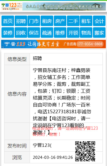 宁晋县东南汪村;梓鑫男装,招女辅工多名;工作简单易学分拣;裁剪,裁剪副工,包装;钉扣;锁眼;工资结算灵活;长期稳定;时间自由可协商!广场东一百米,电话15227318181非诚勿扰谢谢 【电话咨询时,请一定说明在宁晋123看到的,谢谢!】 |