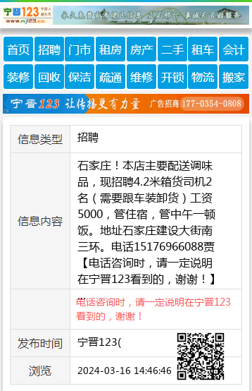 石家庄!本店主要配送调味品,现招聘4.2米箱货司机2名(需要跟车装卸货)工资5000,管住宿,管中午一顿饭。地址石家庄建设大街南三环。电话15176966088贾 【电话咨询时,请一定说明在宁晋123看到的,谢谢!】 |