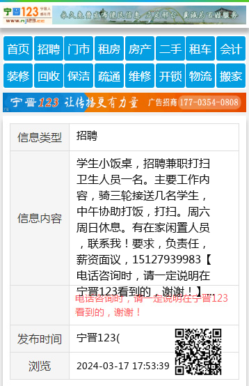 学生小饭桌,招聘兼职打扫卫生人员一名。主要工作内容,骑三轮接送几名学生,中午协助打饭,打扫。周六周日休息。有在家闲置人员,联系我!要求,负责任,薪资面议,15127939983 【电话咨询时,请一定说明在宁晋123看到的,谢谢!】 |