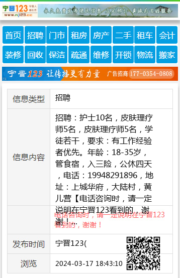 招聘:护士10名,皮肤理疗师5名,皮肤理疗师5名,学徒若干,要求:有工作经验者优先。年龄:18-35岁,管食宿,入三险,公休四天,电话:19948291896,地址:上城华府,大陆村,黄儿营 【电话咨询时,请一定说明在宁晋123看到的,谢谢!】 |