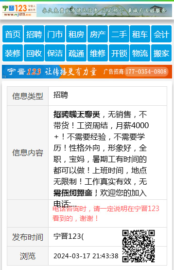 | 防骗提醒: | 宁晋123(www.nj123.cc)提醒您:手工活、网络兼职、刷单,都是骗子!凡以各种名义收取费用的都是骗子!找工作是往兜里挣钱,让你往外掏钱的都是骗子!异地招聘请提高警惕,谨防诈骗! |
