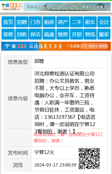 河北翔泰检测认证有限公司招聘:办公文员数名,男女不限,大专以上学历,熟悉电脑办公,会开车,工资待遇:入职满一年缴纳三险,节假日轮休,工资面议,电话:13613197367 【电话咨询时,请一定说明在宁晋123看到的,谢谢!】 |