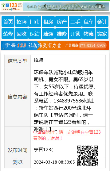 环保车队诚聘小电动吸扫车司机,男女不限。男65岁以下,女55岁以下,待遇优厚。有工作经验者优先录用。联系电话;13483975586地址;新车站西行200米路北环保车队 【电话咨询时,请一定说明在宁晋123看到的,谢谢!】 |