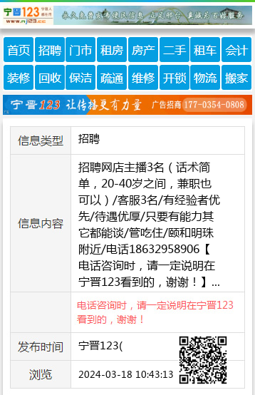 招聘网店主播3名(话术简单,20-40岁之间,兼职也可以)/客服3名/有经验者优先/待遇优厚/只要有能力其它都能谈/管吃住/颐和明珠附近/电话18632958906 【电话咨询时,请一定说明在宁晋123看到的,谢谢!】 |