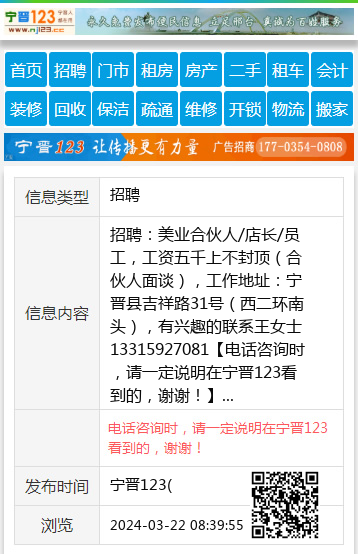招聘:美业合伙人/店长/员工,工资五千上不封顶(合伙人面谈),工作地址:宁晋县吉祥路31号(西二环南头),有兴趣的联系王女士13315927081 【电话咨询时,请一定说明在宁晋123看到的,谢谢!】 |