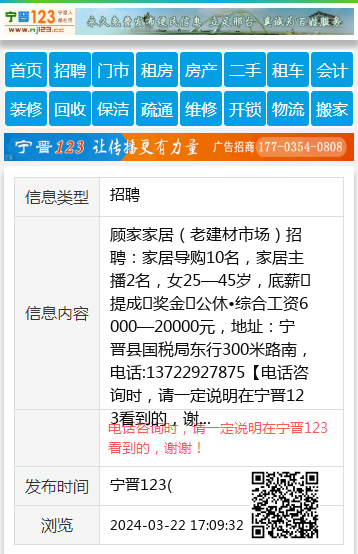 顾家家居(老建材市场)招聘:家居导购10名,家居主播2名,女25—45岁,底薪➕提成➕奖金➕公休•综合工资6000—20000元,地址:宁晋县国税局东行300米路南,电话:13722927875 【电话咨询时,请一定说明在宁晋123看到的,谢谢!】 |