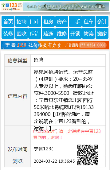 易缆网招聘运营、运营总监(可培训)要求:20~35岁大专及以上,熟悉电脑办公软件.3000-5500+绩效.地址:宁晋县东汪镇派出所西行50米路北易缆网.电话19133394000 【电话咨询时,请一定说明在宁晋123看到的,谢谢!】 |