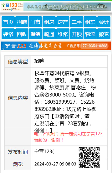 杉鼎汗蒸时代招聘收银员、服务员、领班、文员、烧烤师傅、炒菜厨师.管吃住,综合薪资3000-5000。咨询电话:18031999927、15226898962地址:状元路上城御府东门 【电话咨询时,请一定说明在宁晋123看到的,谢谢!】 |