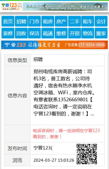 郑州电缆库房高薪诚聘:司机3名,普工数名,公司待遇好,宿舍有热水器净水机空调冰箱、WiFi,室内仓库。有意者联系13526669801 【电话咨询时,请一定说明在宁晋123看到的,谢谢!】 |