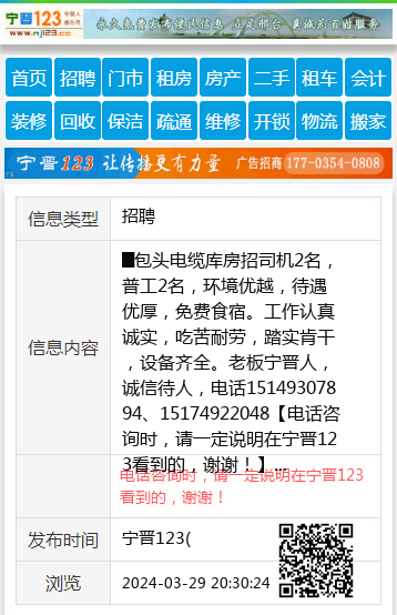 █包头电缆库房招司机2名,普工2名,环境优越,待遇优厚,免费食宿。工作认真诚实,吃苦耐劳,踏实肯干,设备齐全。老板宁晋人,诚信待人,电话15149307894、15174922048 【电话咨询时,请一定说明在宁晋123看到的,谢谢!】 |