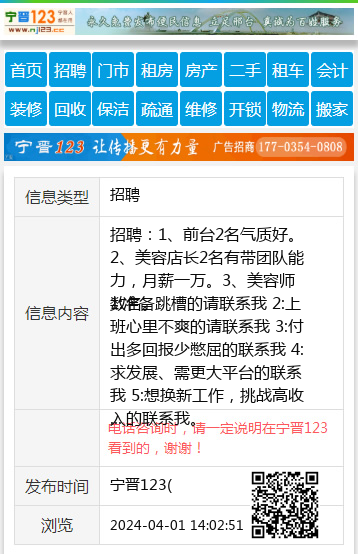 招聘:1、前台2名气质好。2、美容店长2名有带团队能力,月薪一万。3、美容师数名。