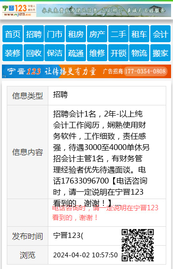 招聘会计1名,2年-以上纯会计工作阅历,娴熟使用财务软件,工作细致,责任感强,待遇3000至4000单休另招会计主管1名,有财务管理经验者优先待遇面谈。电话17633096700 【电话咨询时,请一定说明在宁晋123看到的,谢谢!】 |