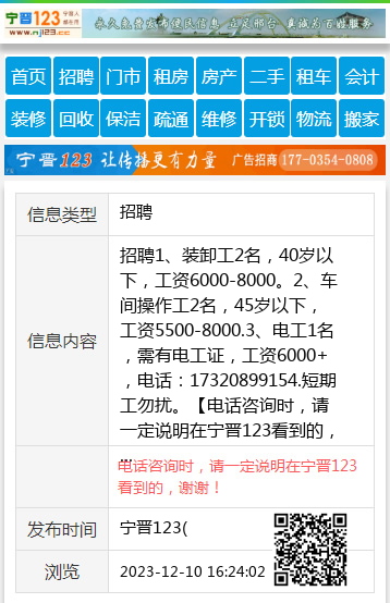 招聘1、装卸工2名,40岁以下,工资6000-8000。2、车间操作工2名,45岁以下,工资5500-8000.3、电工1名,需有电工证,工资6000+,电话:17320899154.短期工勿扰。 【电话咨询时,请一定说明在宁晋123看到的,谢谢!】 |