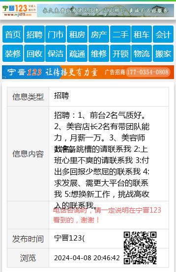 招聘:1、前台2名气质好。2、美容店长2名有带团队能力,月薪一万。3、美容师数名。