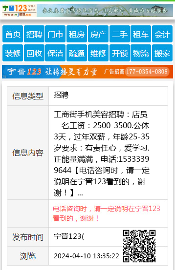 工商街手机美容招聘:店员一名工资:2500-3500.公休3天,过年双薪,年龄25-35岁要求:有责任心,爱学习.正能量满满,电话:15333399644 【电话咨询时,请一定说明在宁晋123看到的,谢谢!】 |