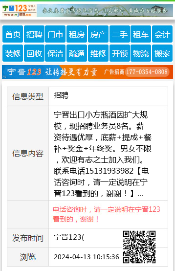 宁晋出口小方瓶酒因扩大规模,现招聘业务员8名。薪资待遇优厚,底薪+提成+餐补+奖金+年终奖。男女不限,欢迎有志之士加入我们。联系电话15131933982 【电话咨询时,请一定说明在宁晋123看到的,谢谢!】 |