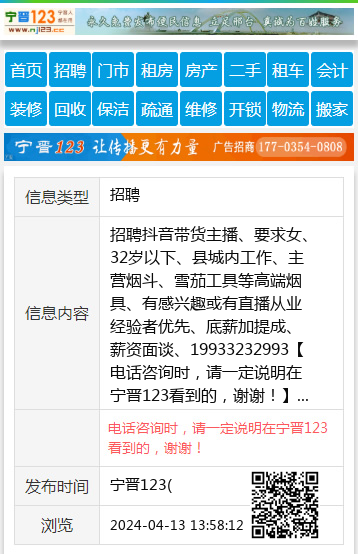 招聘抖音带货主播、要求女、32岁以下、县城内工作、主营烟斗、雪茄工具等高端烟具、有感兴趣或有直播从业经验者优先、底薪加提成、薪资面谈、19933232993 【电话咨询时,请一定说明在宁晋123看到的,谢谢!】 |