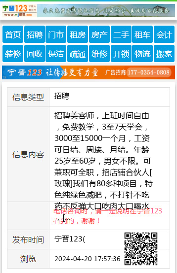 招聘美容师,上班时间自由,免费教学,3至7天学会,3000至15000一个月,工资可日结、周接、月结。年龄25岁至60岁,男女不限。可兼职可全职,招店铺合伙人[玫瑰]我们有80多种项目,特色纯绿色减肥,不打针不吃药不反弹大口吃肉大口喝水,[玫瑰]免收加盟费。我们可以死店做活,活店做火🔥