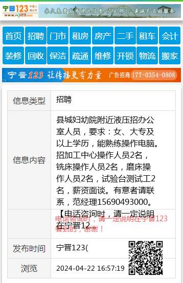 县城妇幼院附近液压招办公室人员,要求:女、大专及以上学历,能熟练操作电脑。招加工中心操作人员2名,铣床操作人员2名,磨床操作人员2名,试验台测试工2名,薪资面谈。有意者请联系,范经理15690493000。 【电话咨询时,请一定说明在宁晋123看到的,谢谢!】 |