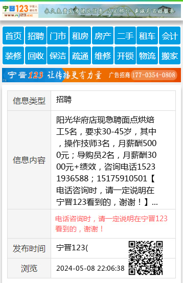 阳光华府店现急聘面点烘焙工5名,要求30-45岁,其中,操作技师3名,月薪酬5000元;导购员2名,月薪酬3000元+绩效,咨询电话15231936588;15175910501 【电话咨询时,请一定说明在宁晋123看到的,谢谢!】 |