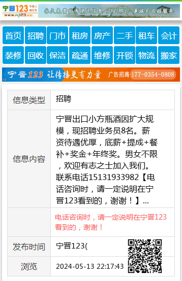 宁晋出口小方瓶酒因扩大规模,现招聘业务员8名。薪资待遇优厚,底薪+提成+餐补+奖金+年终奖。男女不限,欢迎有志之士加入我们。联系电话15131933982 【电话咨询时,请一定说明在宁晋123看到的,谢谢!】 |