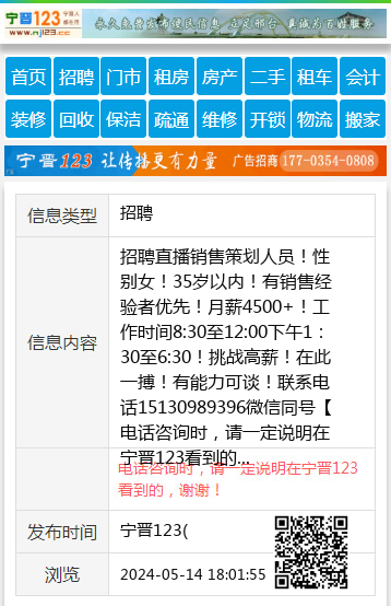 招聘直播销售策划人员!性别女!35岁以内!有销售经验者优先!月薪4500+!工作时间8:30至12:00下午1:30至6:30!挑战高薪!在此一搏!有能力可谈!联系电话15130989396微信同号 【电话咨询时,请一定说明在宁晋123看到的,谢谢!】 |