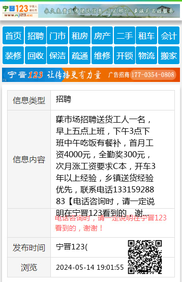 菜市场招聘送货工人一名,早上五点上班,下午3点下班中午吃饭有餐补,首月工资4000元,全勤奖300元,次月涨工资要求C本,开车3年以上经验,乡镇送货经验优先,联系电话13315928883 【电话咨询时,请一定说明在宁晋123看到的,谢谢!】 |