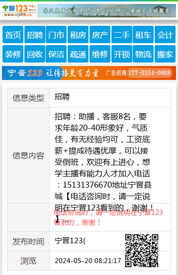 招聘:助播,客服8名,要求年龄20-40形象好,气质佳,有无经验均可,工资底薪+提成待遇优厚,可以接受倒班,欢迎有上进心,想学主播有能力人才加入电话:15131376670地址宁晋县城 【电话咨询时,请一定说明在宁晋123看到的,谢谢!】 |