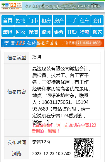 晶达包装有限公司诚招会计、质检员、技术工、普工若干名,工资待遇优厚,有工作经验和学历较高者优先录用。地点:河渠油坊村东。联系人:18631175051、15194937689 【电话咨询时,请一定说明在宁晋123看到的,谢谢!】 |