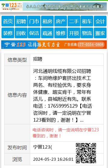河北通明线缆有限公司招聘:车间绝缘护套挤出技术工两名、有经验优先,要求身体健康、踏实肯干,常年有活儿,县城附近有先。联系电话:17659995129 【电话咨询时,请一定说明在宁晋123看到的,谢谢!】 |