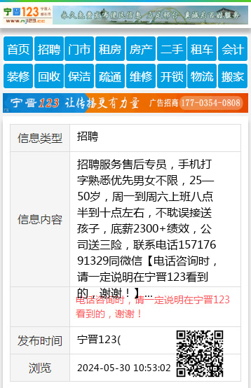 招聘服务售后专员,手机打字熟悉优先男女不限,25—50岁,周一到周六上班八点半到十点左右,不耽误接送孩子,底薪2300+绩效,公司送三险,联系电话15717691329同微信 【电话咨询时,请一定说明在宁晋123看到的,谢谢!】 |