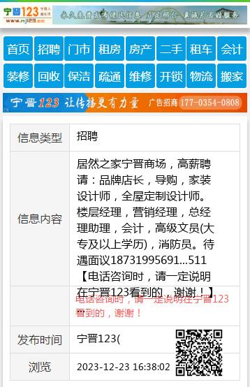 居然之家宁晋商场,高薪聘请:品牌店长,导购,家装设计师,全屋定制设计师。楼层经理,营销经理,总经理助理,会计,高级文员(大专及以上学历),消防员。待遇面议18731995691...511 【电话咨询时,请一定说明在宁晋123看到的,谢谢!】 |