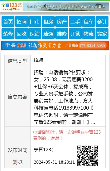 招聘:电话销售2名要求:女,25-38,无责底薪3200+社保+6天公休,提成高,专业人员手把手教,公司发展前景好,工作地点:方大科技园电话19133997100 【电话咨询时,请一定说明在宁晋123看到的,谢谢!】 |