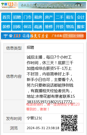 诚招主播,每日7个小时工作时间,休三天!底薪三千加提成综合薪资5千-1万上不封顶,内容简单好上手,新手小白也可,主要看个人努力只要敢说话都能挣到钱,有直播相关经验者优先,地址:水榭花都有意者联系15383335397/18021517772 【电话咨询时,请一定说明在宁晋123看到的,谢谢!】 |