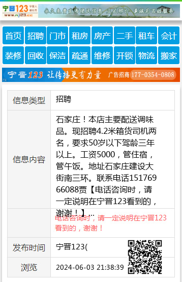 石家庄!本店主要配送调味品。现招聘4.2米箱货司机两名,要求50岁以下驾龄三年以上。工资5000,管住宿,管午饭。地址石家庄建设大街南三环。联系电话15176966088贾 【电话咨询时,请一定说明在宁晋123看到的,谢谢!】 |