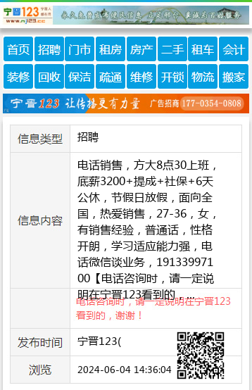 电话销售,方大8点30上班,底薪3200+提成+社保+6天公休,节假日放假,面向全国,热爱销售,27-36,女,有销售经验,普通话,性格开朗,学习适应能力强,电话微信谈业务,19133997100 【电话咨询时,请一定说明在宁晋123看到的,谢谢!】 |