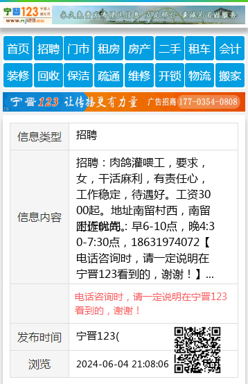 招聘:肉鸽灌喂工,要求,女,干活麻利,有责任心,工作稳定,待遇好。工资3000起。地址南留村西,南留附近优先。