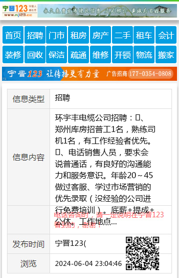环宇丰电缆公司招聘:❶、郑州库房招普工1名,熟练司机1名,有工作经验者优先。❷、电话销售人员,要求会说普通话,有良好的沟通能力和服务意识。年龄20~45做过客服、学过市场营销的优先录取(没经验的公司进行免费培训)。底薪+提成+公休。工作地点:天一广场附近,联系电话 13131939710 【电话咨询时,请一定说明在宁晋123看到的,谢谢!】 |