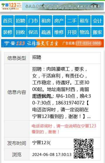 招聘:肉鸽灌喂工,要求,女,干活麻利,有责任心,工作稳定,待遇好。工资3000起。地址南留村西,南留附近优先。