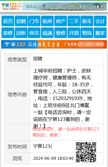 上城华府招聘:护士,皮肤理疗师,健康管理师,有无经验均可,年龄:18-35岁,管食宿,入三险,公休四天,电话:15203291939,地址:上班华府B区北门博鳌一龄 【电话咨询时,请一定说明在宁晋123看到的,谢谢!】 |