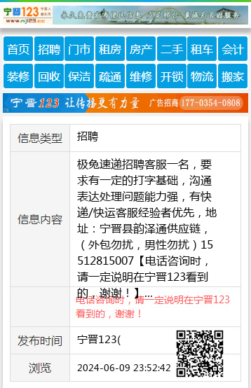 极兔速递招聘客服一名,要求有一定的打字基础,沟通表达处理问题能力强,有快递/快运客服经验者优先,地址:宁晋县韵泽通供应链,(外包勿扰,男性勿扰)15512815007 【电话咨询时,请一定说明在宁晋123看到的,谢谢!】 |