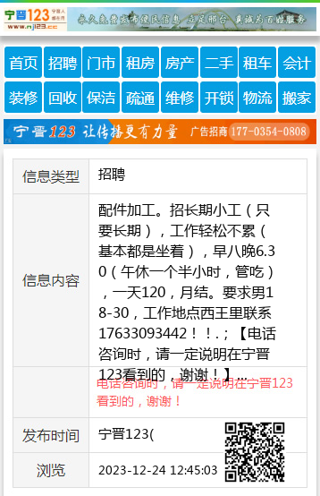 配件加工。招长期小工(只要长期),工作轻松不累(基本都是坐着),早八晚6.30(午休一个半小时,管吃),一天120,月结。要求男18-30,工作地点西王里联系17633093442!!.; 【电话咨询时,请一定说明在宁晋123看到的,谢谢!】 |